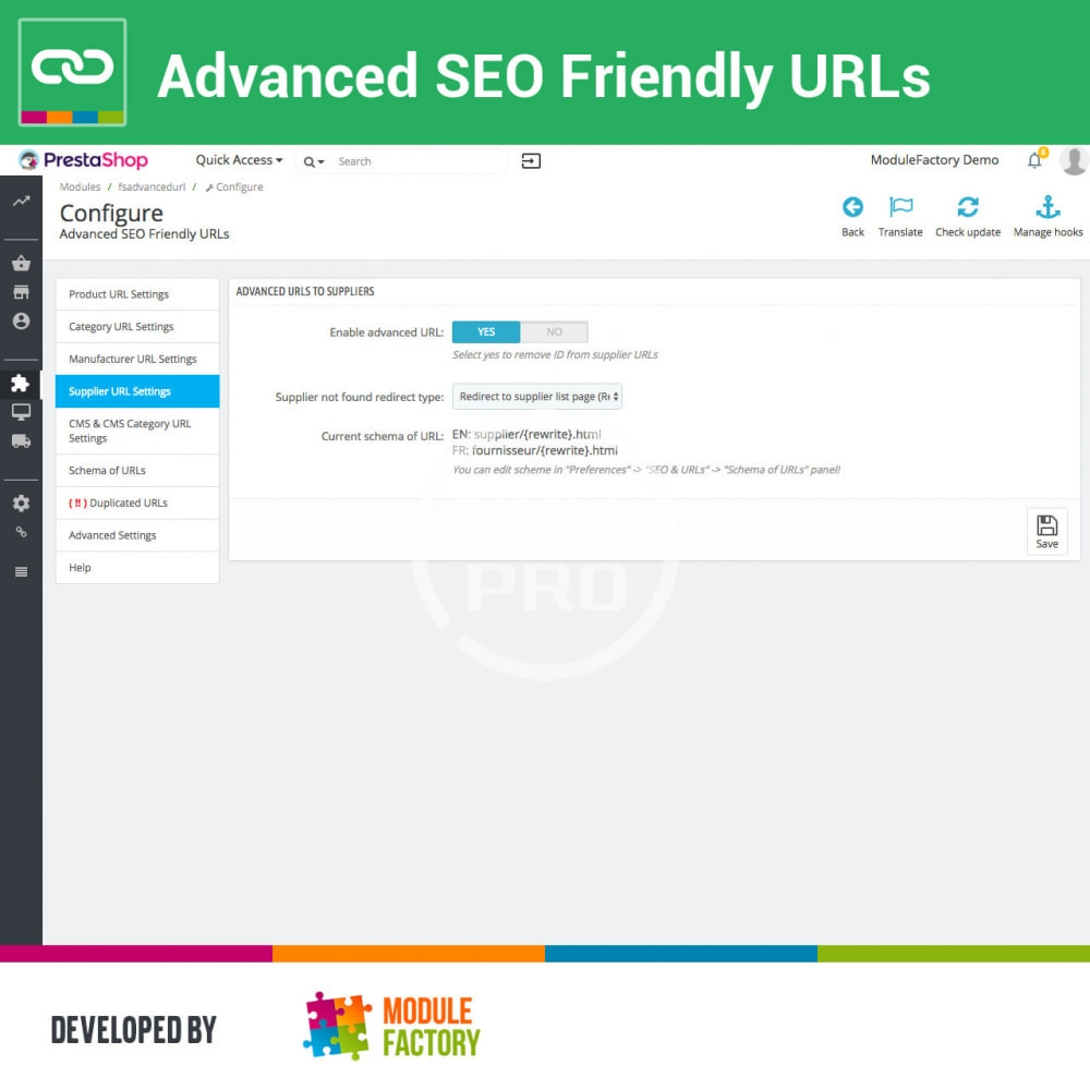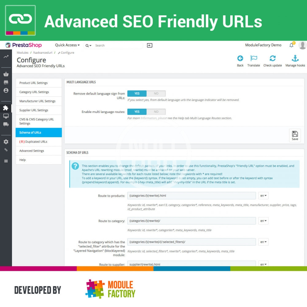 - Remove ID from all URLs: Product, Category, Manufacturer, Supplier, CMS, CMS Category.