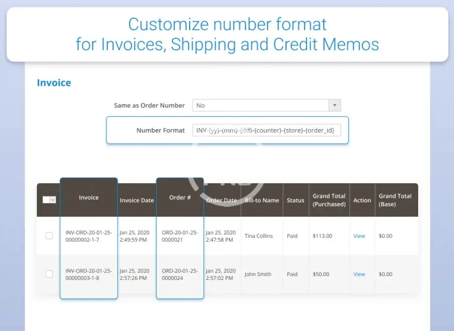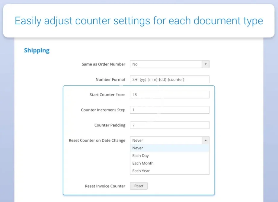 Easily manage your store documents numbering using prefixes and custom starting numbers. Fluently change counter increment step to protect your business data from competitors and attract more customers.