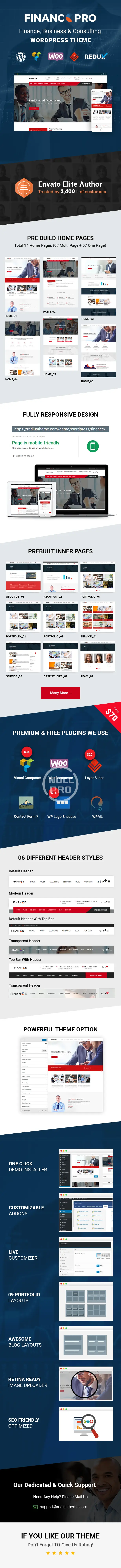 Finance is a clean and modern finance WordPress theme with considerable wealth in features. We have outfitted this theme for financial advisors, accountants, consulting firms, insurance companies, tax advisors, loan management firms, and investment firms, among others.With Finance Pro, you don’t have to create new pages from scratch – we have included myriads of layout options for you. This theme has 7 multipage and 7 onepage homepages, which you can apply to your site with a single click. We have also included many inner pages with variations. Finance Pro has 3 testimonial layouts, 12 portfolio layouts (6 grid, 3 isotope, & carousel slider), 9 team layouts (3 grid & 6 slider), 11 service layouts (6 grid & 5 sliders), and 6 case study layouts (4 grid, & 2 slider). The theme has 7 header styles that can take more than 15 header variations.